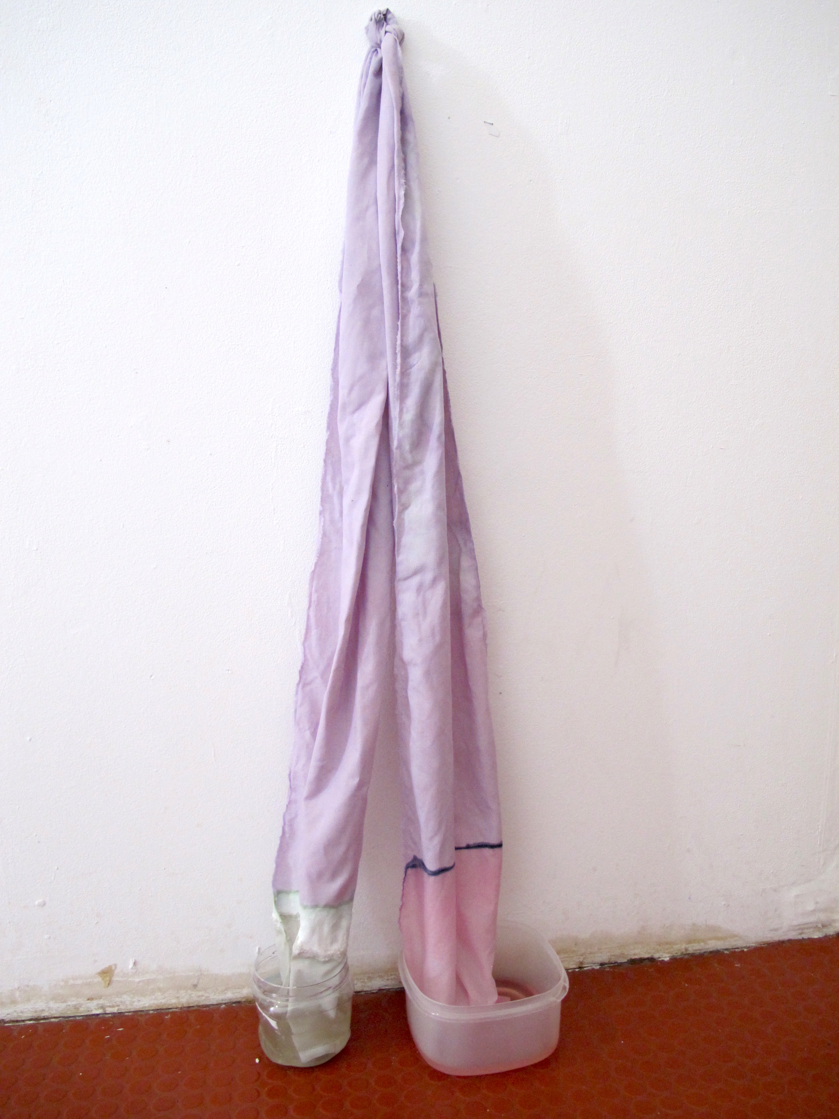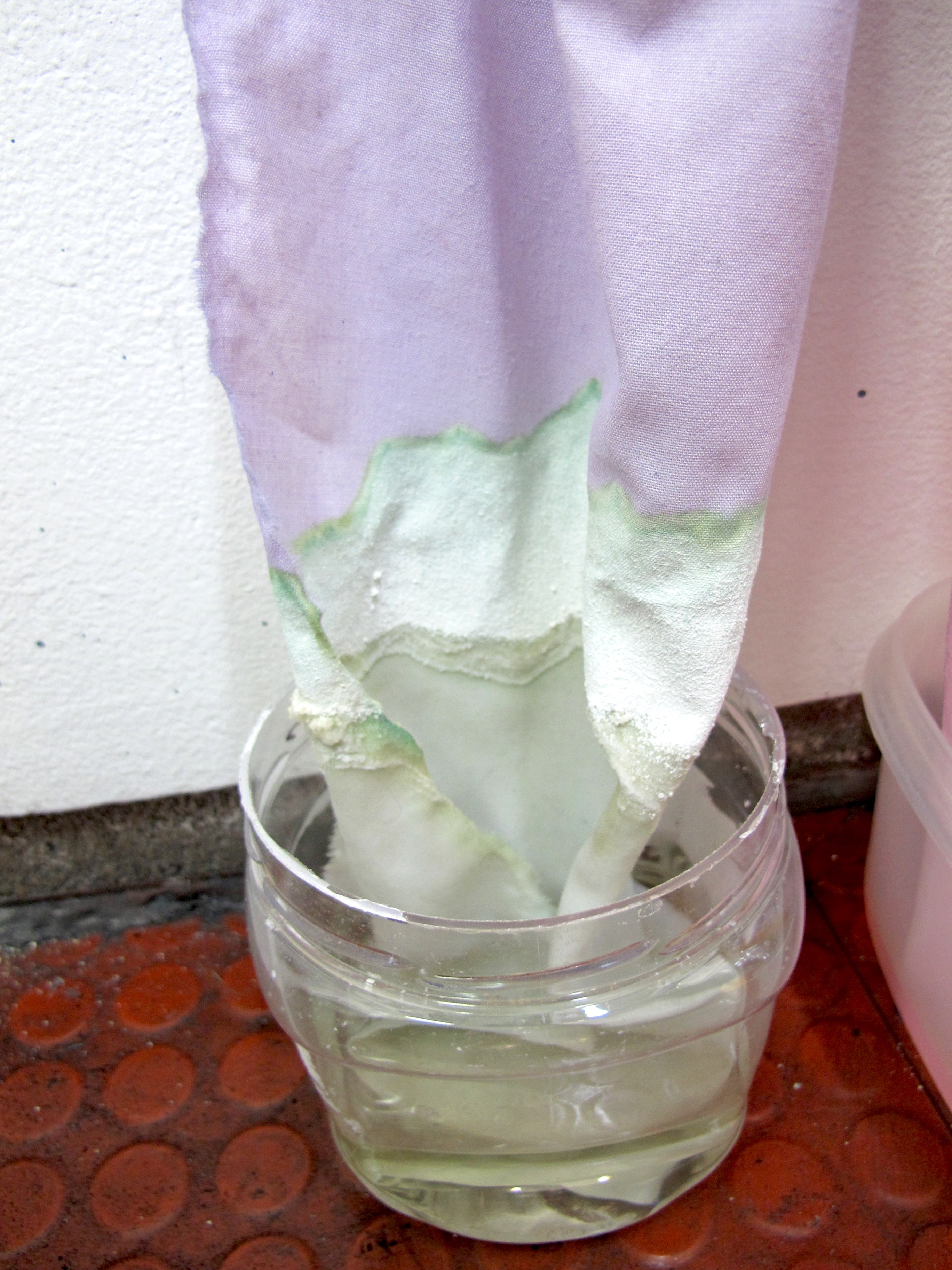 strip of cotton bed sheet soaked in red cabbage juice, carbon steel nail, 2 plastic containers, tap water, white vinegar, sodium bicarbonate, the passing of time